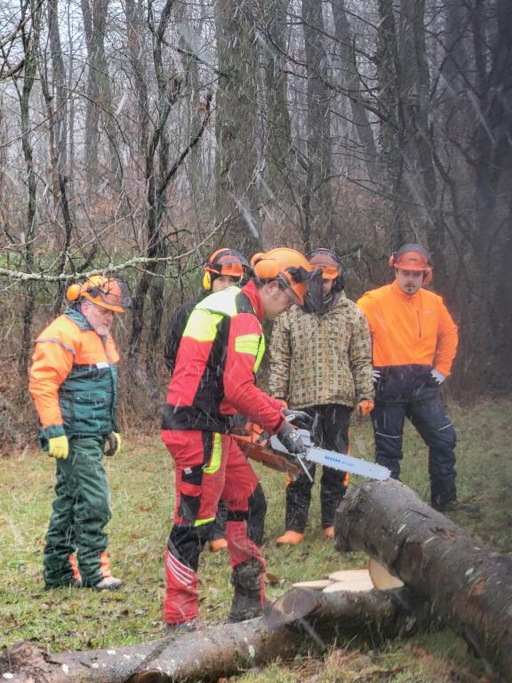 Schwerpunkte waren weiter die persönliche Schutzausrüstung (Helm mit Visier und Gehörschutz, Schnittschutzhose, Schnittschutzstiefel), die Wartung und Pflege einer Motorsäge einschließlich Zerlegens z.B. für Reinigungszwecke.Die Theorie wurde nach der Mittagspause und einer Stärkung durch einen praktischen Teil im Freien ergänzt. Die Teilnehmer, ausgestattet mit ihrer Schutzausrüstung übten unter realen Bedingungen den sicheren Umgang mit der Motorsäge.
